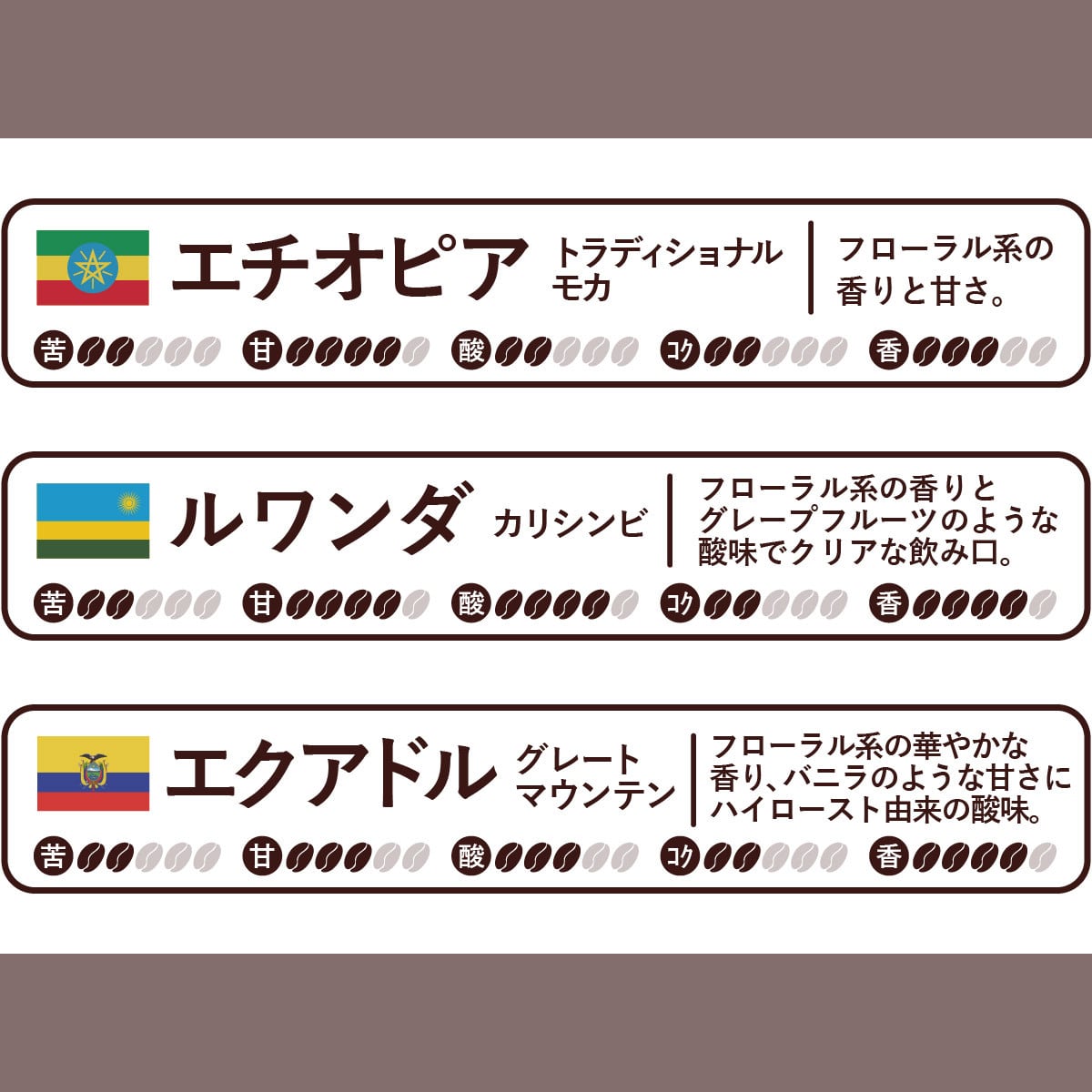紅茶のような華やかさをベースに、それぞれの味わいを飲み比べられるドリップコーヒーセットです。